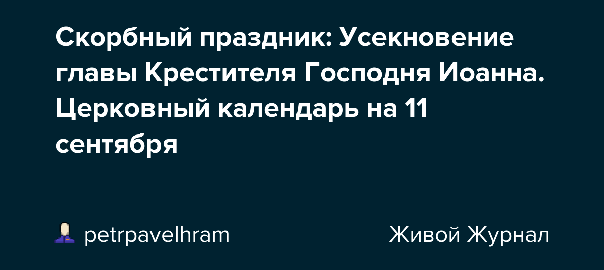 Православный праздник сегодня отличается от всех остальных. 11 сентября православная церковь отмечает усекновение главы иоанна крестителя, пишет в своем материале специально для нв митрополит . В этот день церковь вспоминает о подлом убийстве . О мученической кончине иоанна крестителя в 32 году по рождестве христовом . В день усекновения главы иоанна предтечи церковью вместе с праздником установлен строгий пост «ради воздержательной жизни святого» и его .